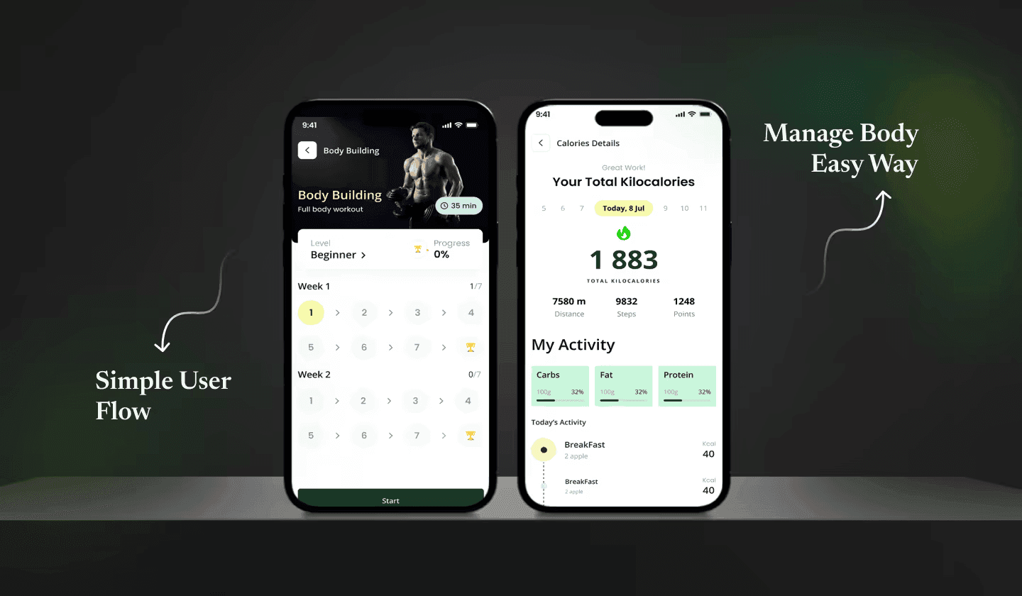 Fitness tracking app UI/UX design with intuitive workouts, progress tracking, activity insights, and a user-friendly interface.